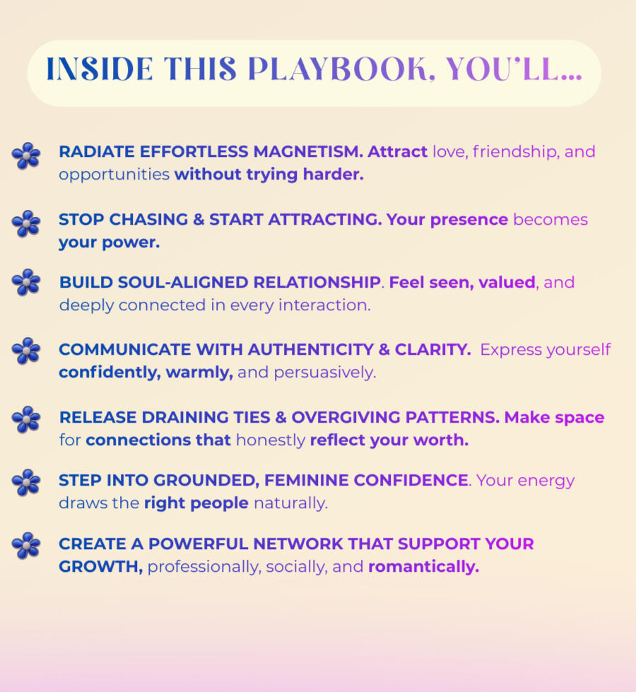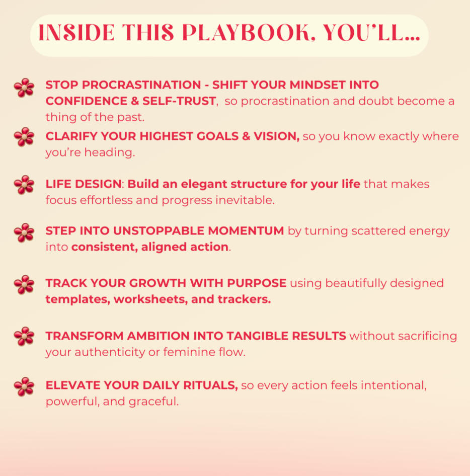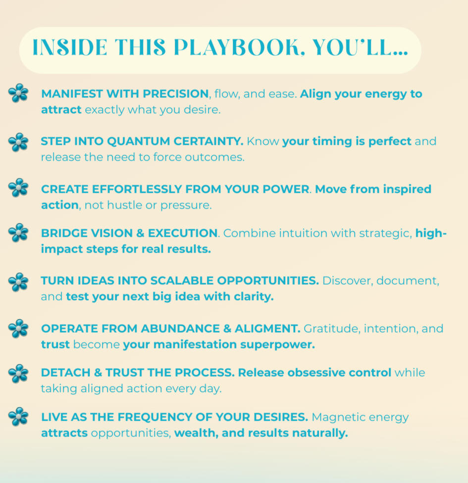 ✦ Heal your nervous system and restore inner peace✦ Realign with your vision through manifestation & quantum principles✦ Shift your identity, elevate your mindset & activate self-trust✦ Lead with confidence, charisma & magnetic presence✦ Create with flow-based discipline, not force✦ Align mind, body & soul in full creative synergy✦ Set soul-aligned goals & build a life by design✦ Cultivate energetic alignment & feminine productivity✦ Rewire beliefs and embody your next-level self✦ Clarify your purpose and move with soulful strategy✦ Activate your abundance mindset, creative vision and intuitive power✦ Become the woman you secretly dreams of being