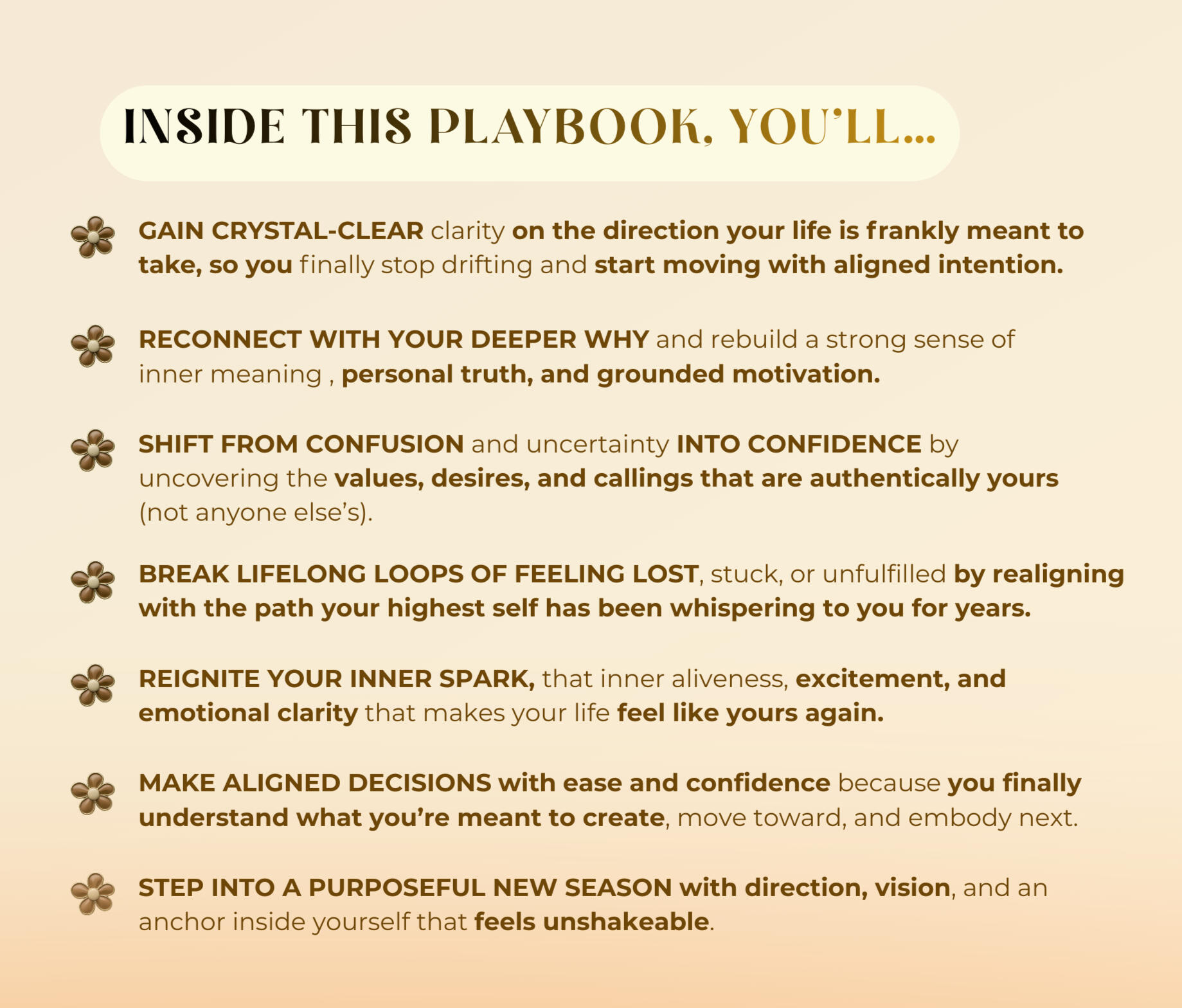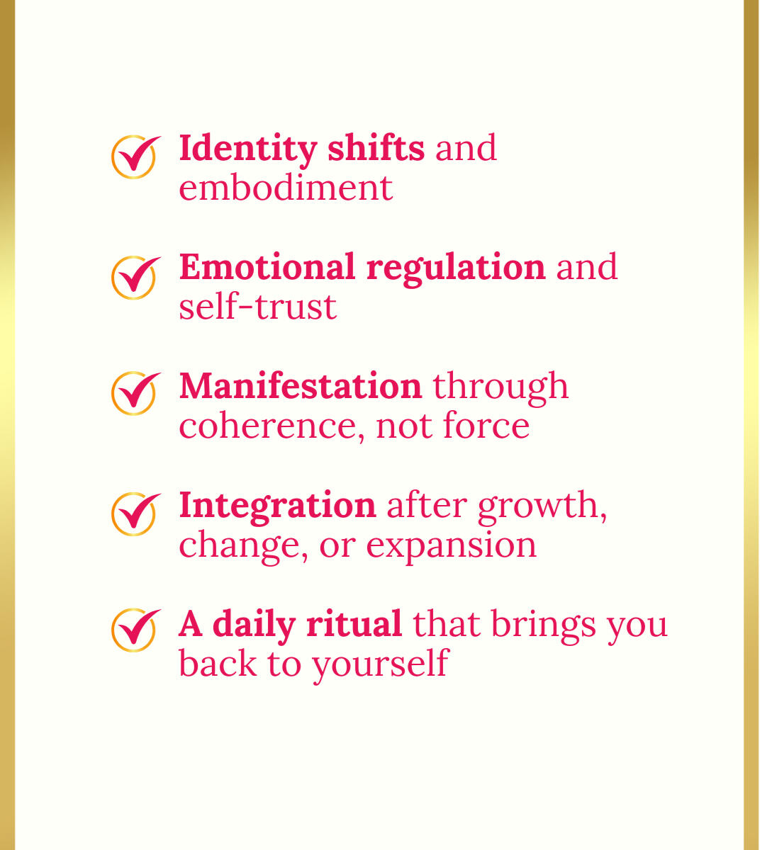 ❀ Heal your nervous system and restore inner peace❀ Realign with your vision through manifestation & quantum principles❀ Shift your identity, elevate your mindset & activate self-trust❀ Lead with confidence, charisma & magnetic presence❀ Create with flow-based discipline, not force❀ Align mind, body & soul in full creative synergy❀ Set soul-aligned goals & build a life by design❀ Cultivate energetic alignment & feminine productivity❀ Rewire beliefs and embody your next-level self❀ Clarify your purpose and move with soulful strategy❀ Activate your abundance mindset, creative vision and intuitive power❀ Become the woman you secretly dreams of being