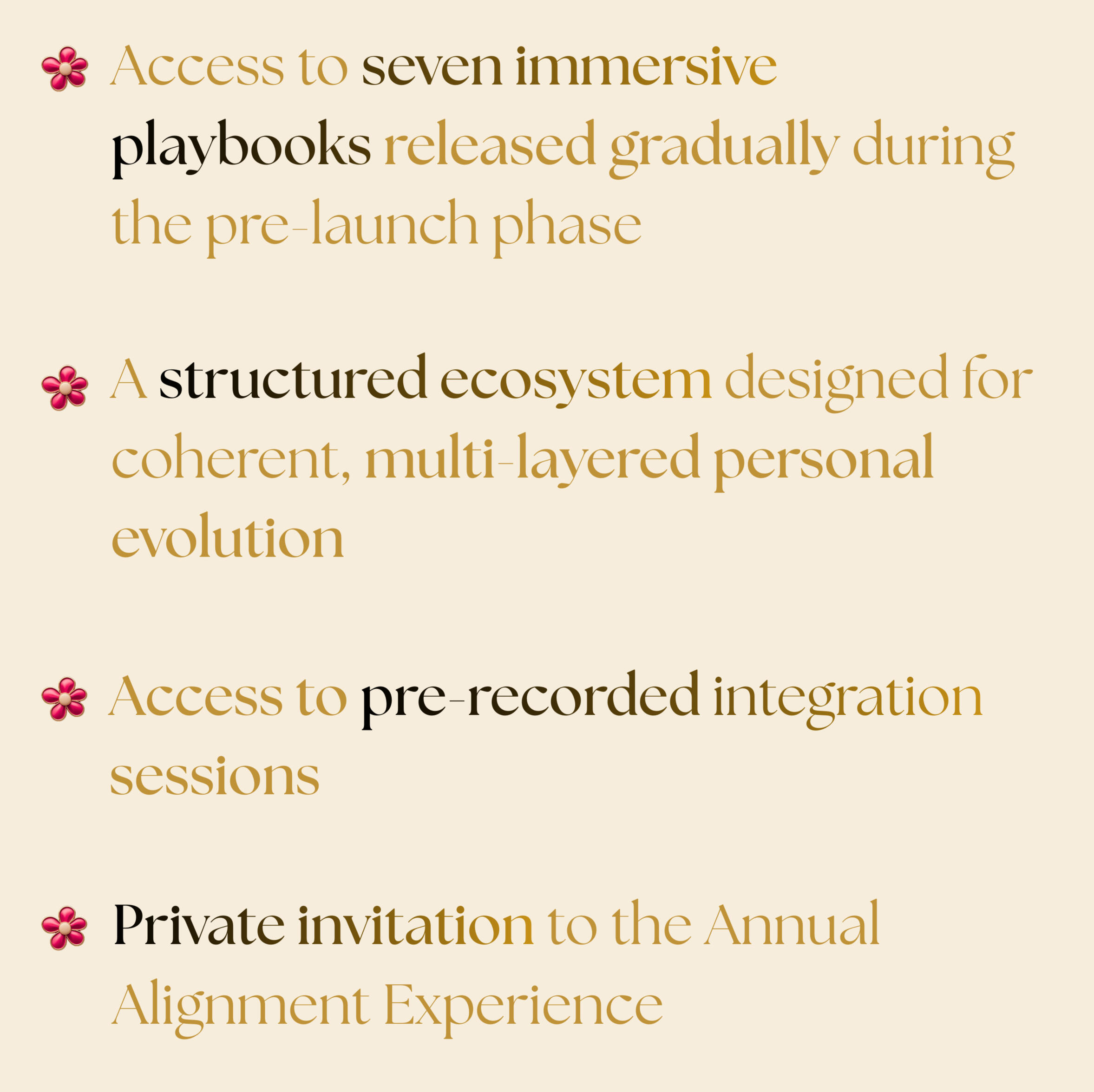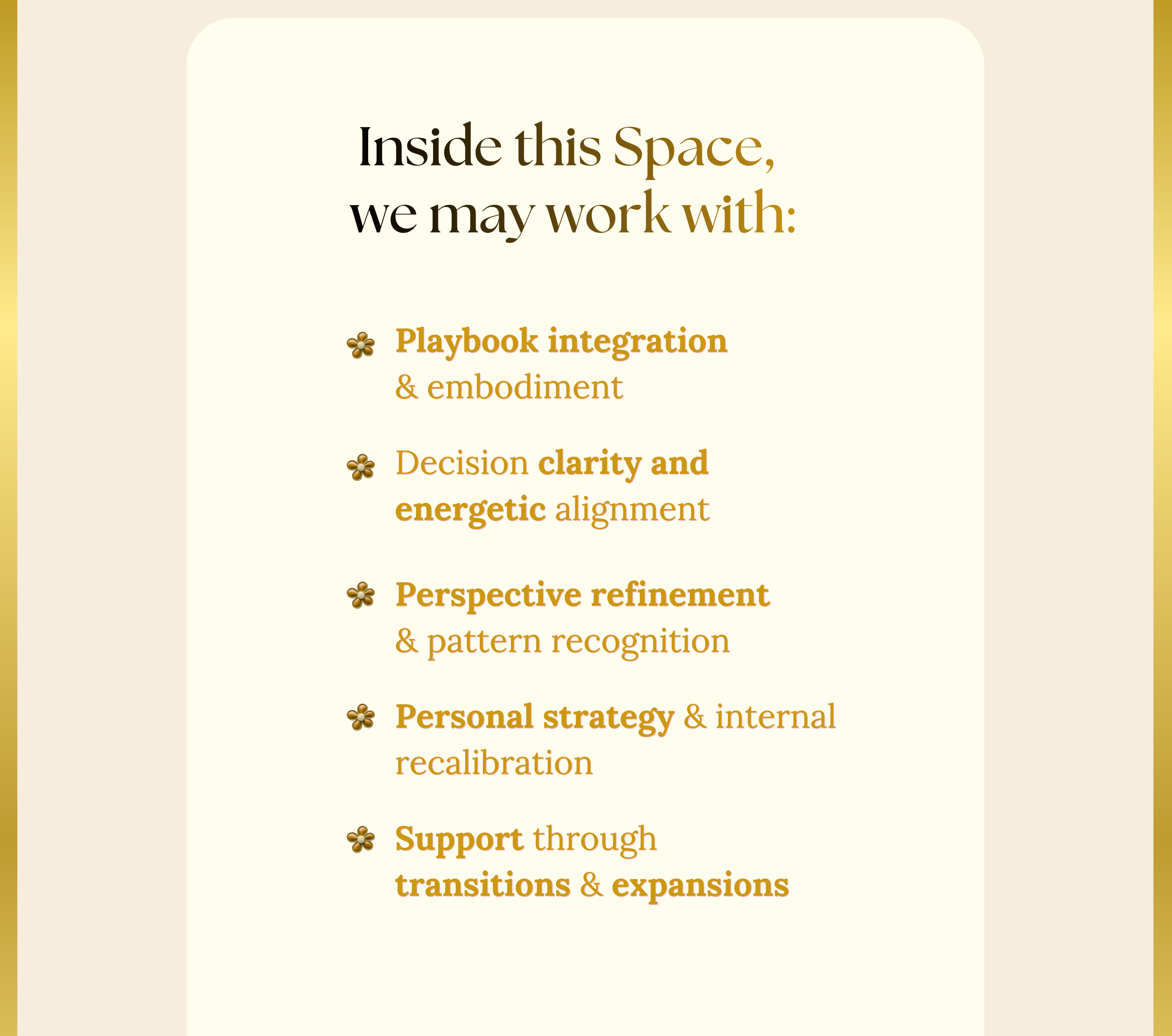❀ Heal your nervous system and restore inner peace❀ Realign with your vision through manifestation & quantum principles❀ Shift your identity, elevate your mindset & activate self-trust❀ Lead with confidence, charisma & magnetic presence❀ Create with flow-based discipline, not force❀ Align mind, body & soul in full creative synergy❀ Set soul-aligned goals & build a life by design❀ Cultivate energetic alignment & feminine productivity❀ Rewire beliefs and embody your next-level self❀ Clarify your purpose and move with soulful strategy❀ Activate your abundance mindset, creative vision and intuitive power❀ Become the woman you secretly dreams of being